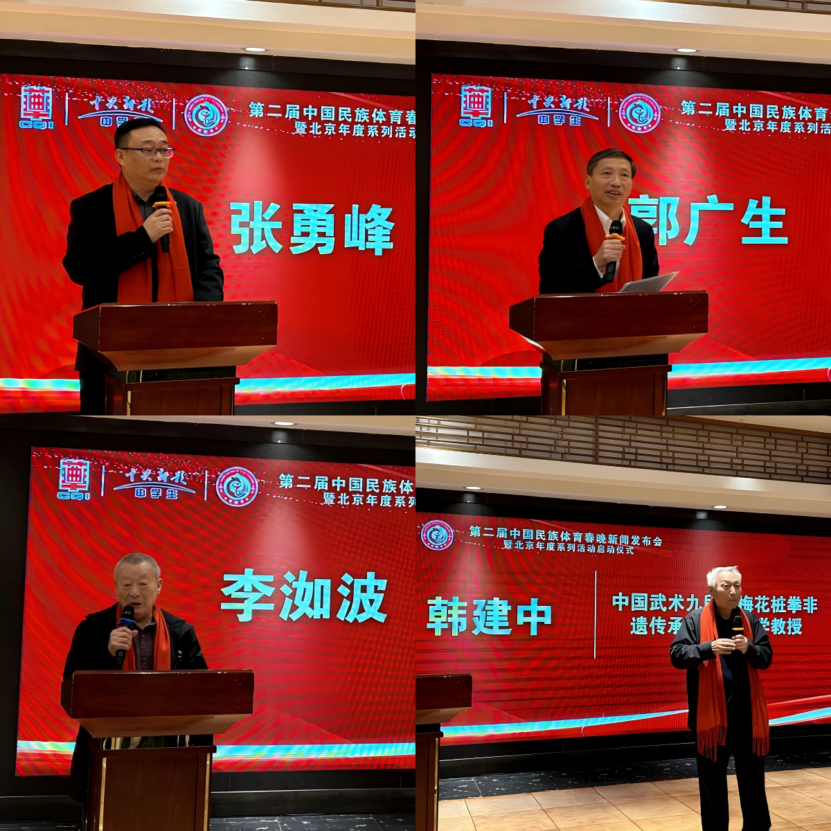 第二届中国民族体育春晚有中华曲艺学会、玖合云启(北京)国际传媒有限公司联合主办,主持人闫嘉欣逐一介绍了到场的各位领导嘉宾:国家质检总局原总检验师、华夏文化促进会会长项玉章;中国广电联合会全民国防宣传教育委员会会长郑志宏;中华曲艺学会常务副会长葛庆龙;中央保健局专家组原组长朱兴;中央民族大学原校长郭广生;中国武术九段、公安大学教授韩建中;国家级非遗心意六合拳传承人李洳波;国家广电总局管理局原局长郭锋;中央广播电视总台“云听”首席战略官李正国;人民日报《中国城市报》社中国城市网主任李自超;环球网副总经理李留申;中国农村信用合作报副社长党云帆等参加了本次发布会。